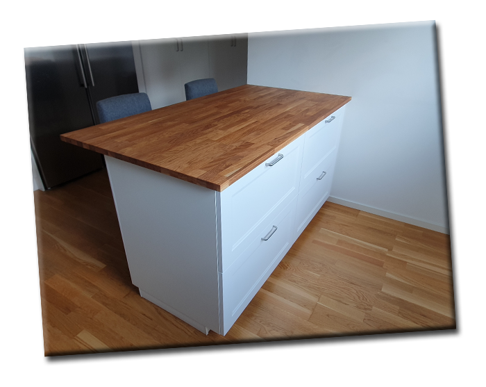 Efter ett par veckor hade vi äntligen fått ihop vår nya köksö, så vi kunde börja packa upp köket alltmer.