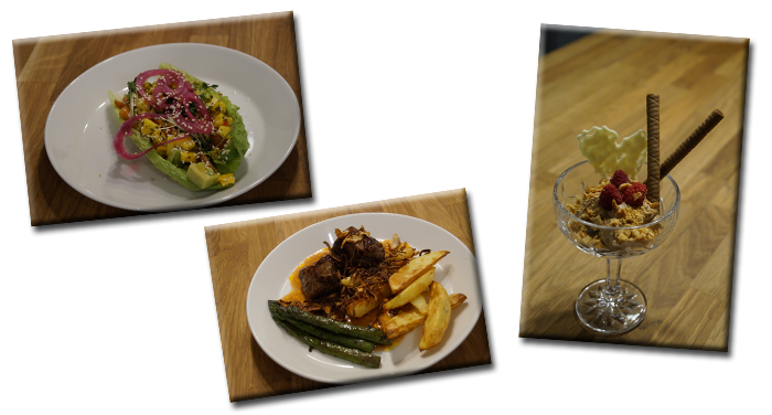Huvudrätt: Timjanbakad karré med klyftpotatis, sparris, rödvinssås, friterad lök och jordärtskockschips.